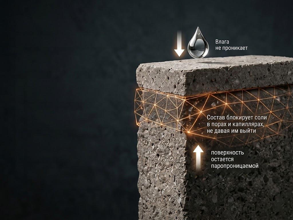 Состав глубоко проникает в поры и капилляры, не давая солям выйти на поверхность. - Паропроницаемость